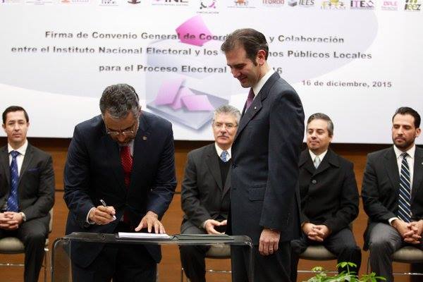Firma del Convenio General de Colaboración y Coordinación entre el INE y el IEE para el Proceso Electoral 2015-2016.