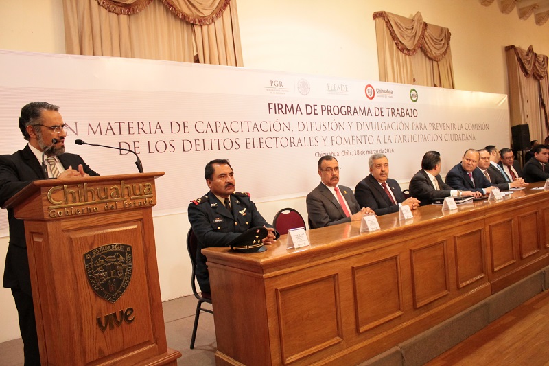 La firma del documento estuvo a cargo del Fiscal Especializadopara la Atención de Delitos Electorales, Santiago Nieto Castillo; del ConsejeroPresidente del IEE, Arturo Meraz González; del Magistrado Presidente del TEE, CésarWong Meraz; del Alcalde de la Ciudad, Javier Garfio Pacheco;  del Fiscal General el Estado, Jorge GonzálezNicolás y del Gobernador de Chihuahua, Cesar Duarte Jáquez.