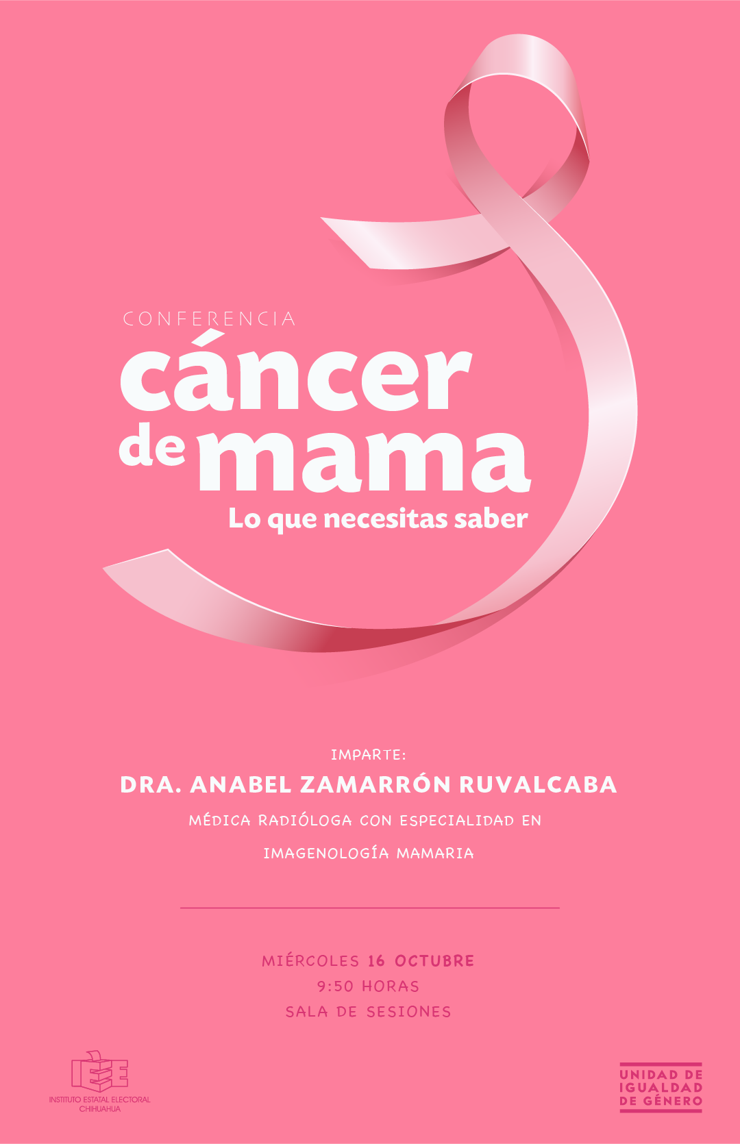 En el mes de octubre, cuando se intensifican las acciones para concientizar sobre los mecanismos de detección oportuna del cáncer mamario, el IEE por conducto de la Unidad de Igualdad de Género, convocó a todo el personal, y al público en general, a la conferencia “Cáncer de mama. Lo que necesitas saber”, impartida por la Dra. Anabel Zamarrón Ruvalcaba, médica radióloga con especialidad en imagenología mamaria.