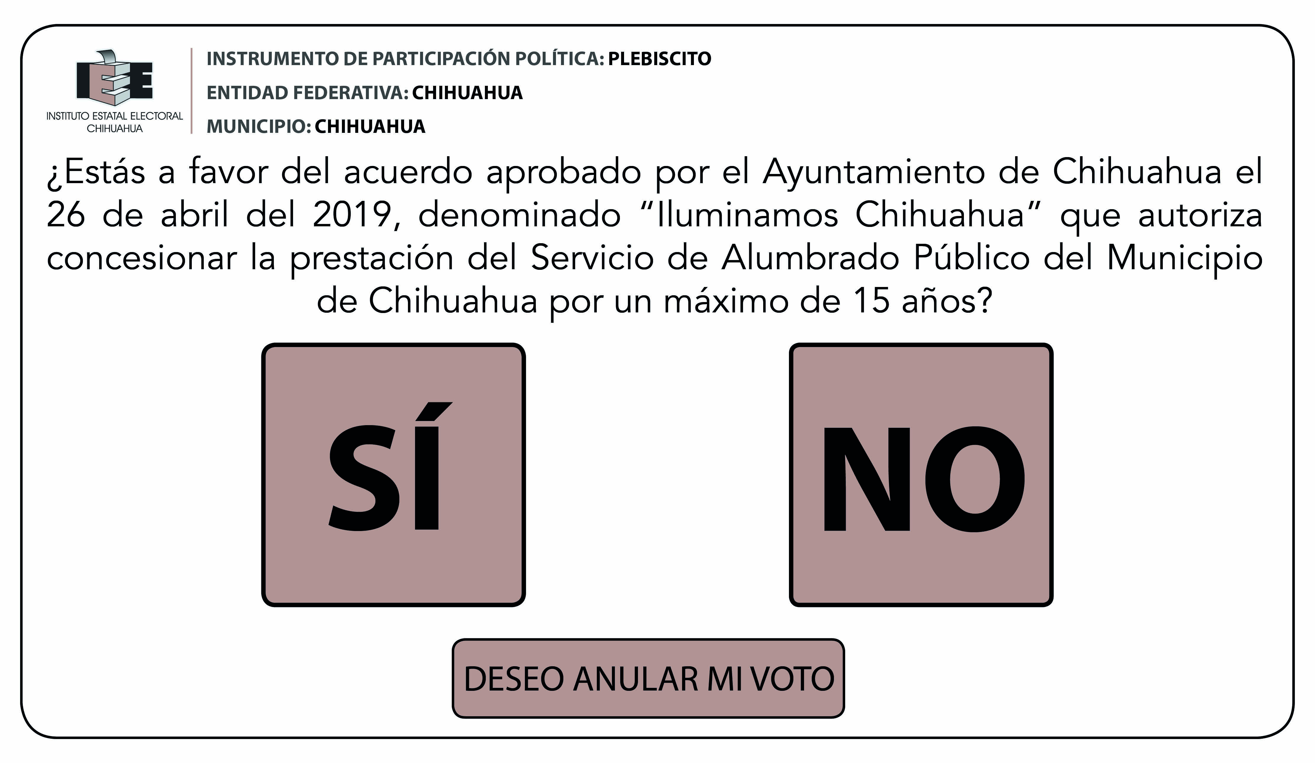 Chihuahua. - El diseño de la boleta electrónica para el plebiscito municipal de Chihuahua fue aprobado por el Consejo Estatal del Instituto Estatal Electoral de Chihuahua (IEE), en la 13ª Sesión Extraordinaria celebrada el 30 de octubre.