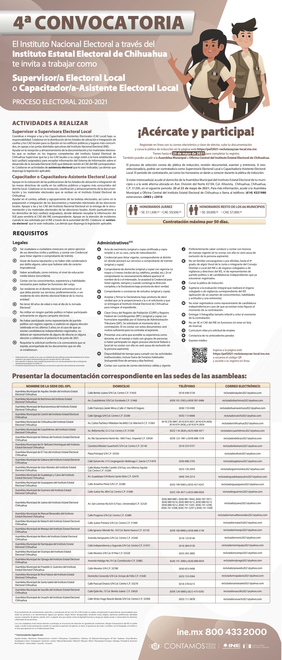 Chihuahua, Chih.- El Instituto Estatal Electoral de Chihuahua (IEE) emitió una cuarta convocatoria para la contratación de Supervisor y Supervisora Electoral o Capacitador y Capacitadora Asistente Electoral Local en  27 municipios del estado.
